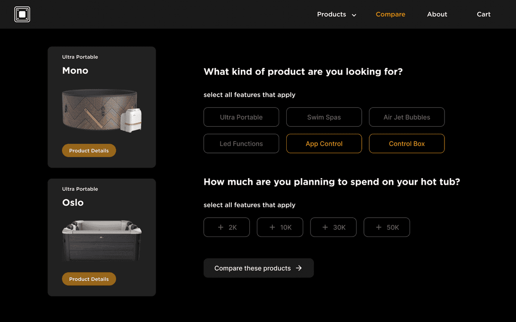 This page helps users find the spa that best fits their needs by comparing models based on price, features, and specifications. It simplifies decision-making and guides users toward the right choice more easily.